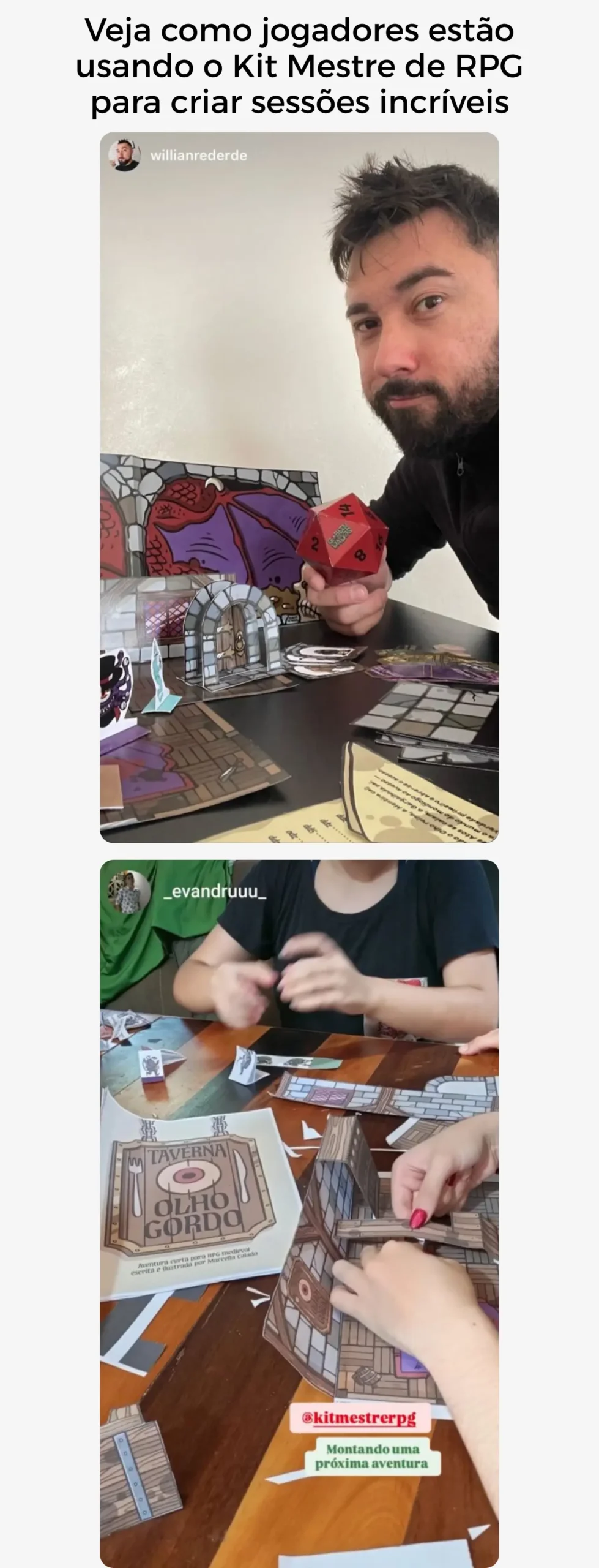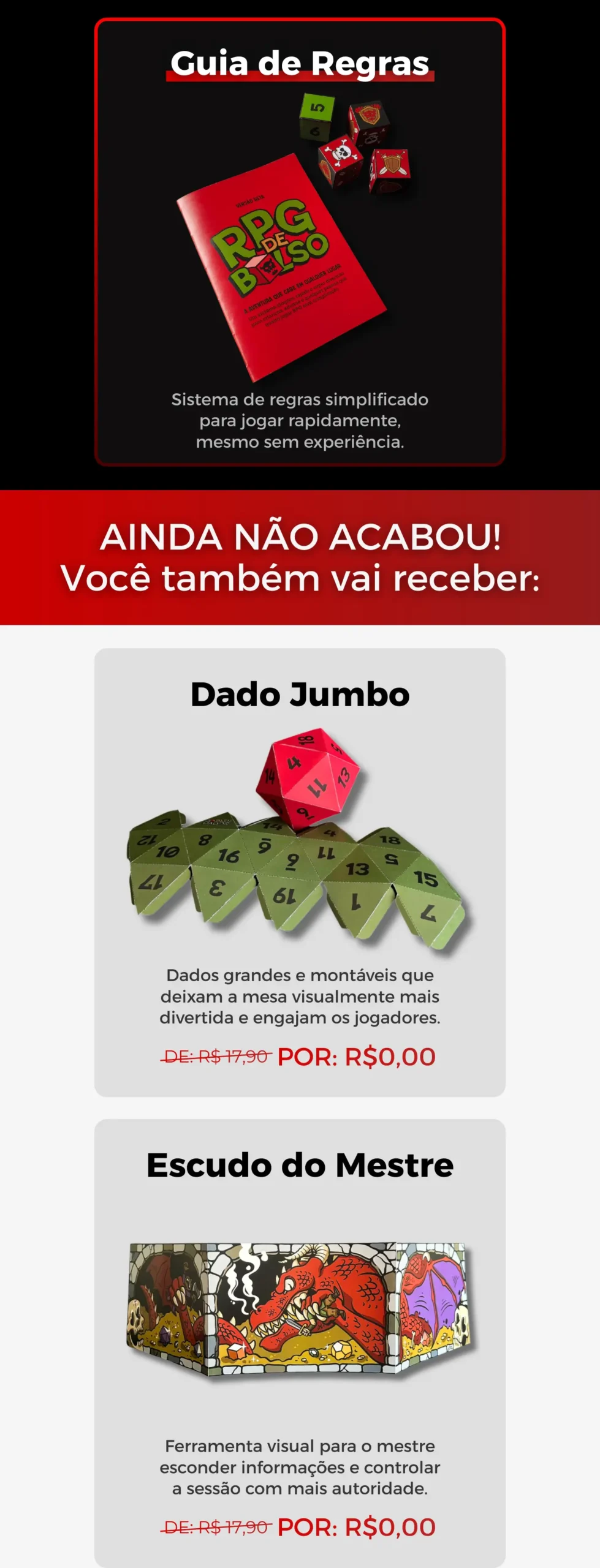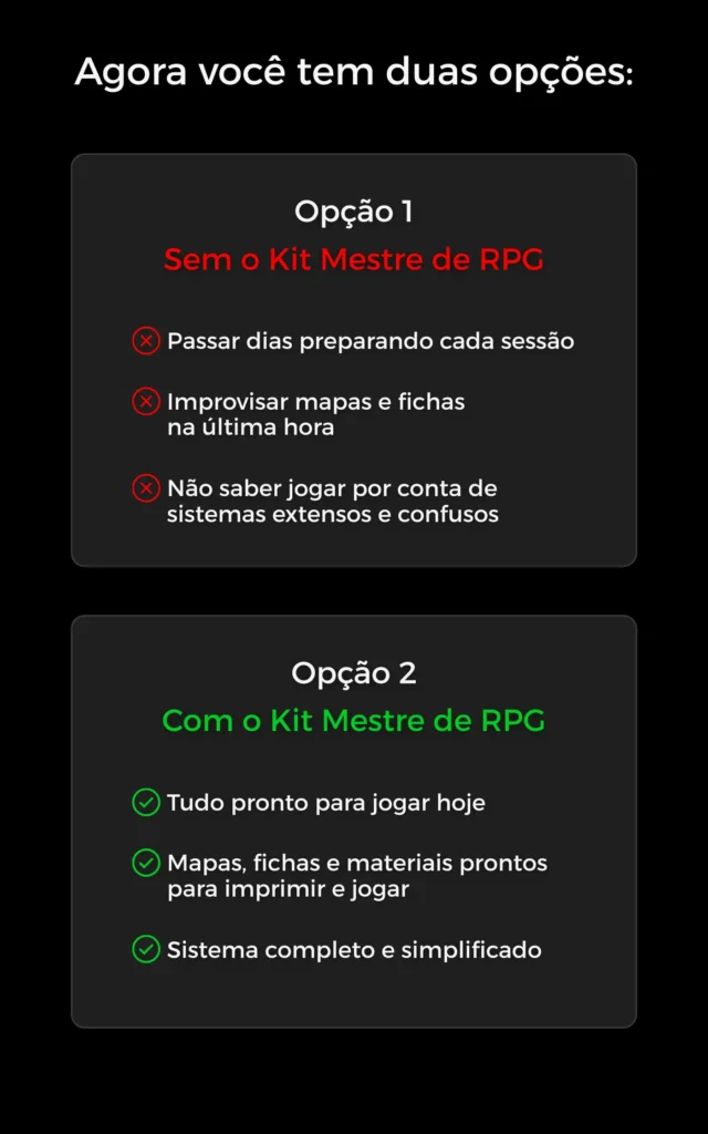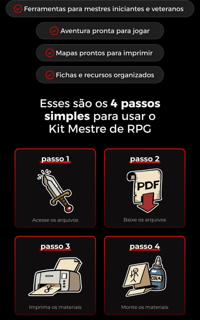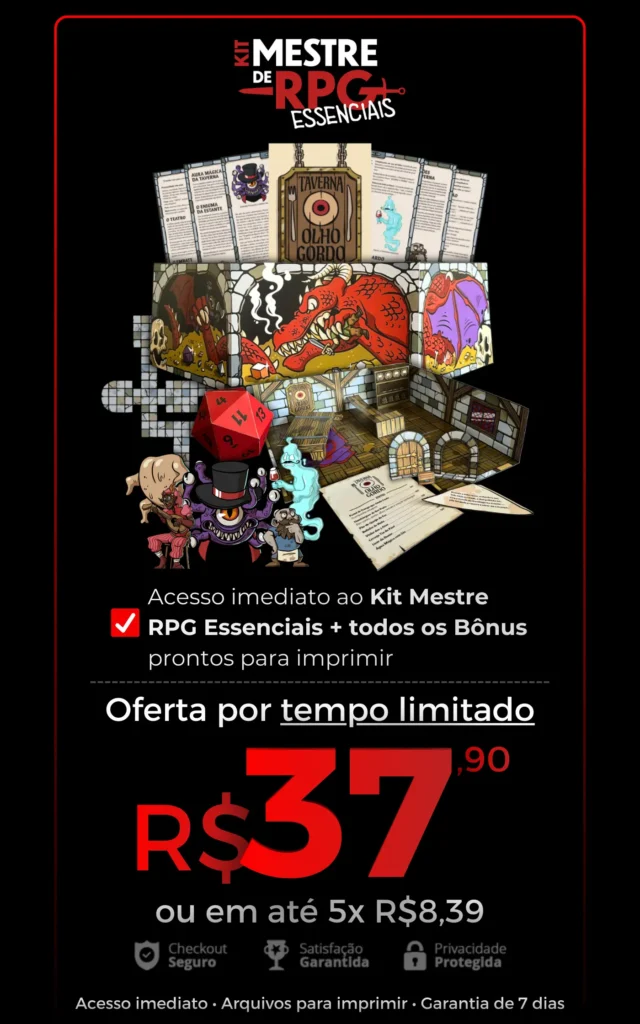 O KIT Mestre de RPG é 100% digital. Você recebe os arquivos em PDF para baixar, imprimir e montar no seu próprio ritmo.
